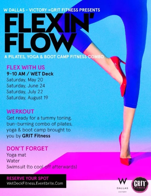 GRIT Fitness and W Dallas - Victory will hold Flexin' Flow on the WET Deck. 60 minutes of Pilates, yoga and boot camp style workout all with the best view in Dallas. Entry is free but space is limited. Spots can be reserved through Eventbrite.